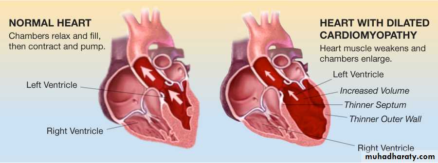 It's usually idiopathic but it may be secondary to other causes, it's characterized by progressive cardiac hypertrophy, dilation and contractile (systole) dysfunction.Dilated cardiomyopathy occur at any age but it usually common between ages of 20-60 years.