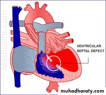 VSDs are the most common congenital heart defects and this like ASDs occur in isolation or in association with other cardiac malformations, the size and location of defect is variable ranging from minute to large defect and this may close spontaneously during infancy or childhood.Morphology:- In large defect associated with significant left to right shunt so right ventricle is hypertrophied and dilated, with pulmonary hypertension developed if this occur so reverse of shunt and cyanosis occur.