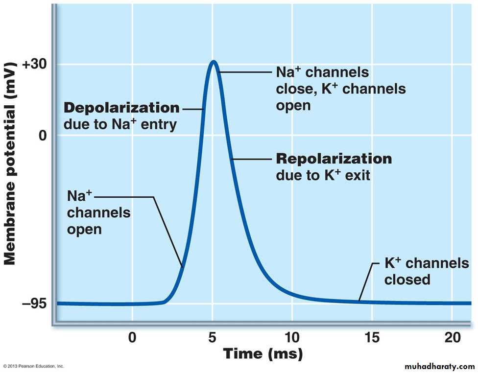 First, the action potential of skeletal muscle is caused almost entirely by the sudden opening of large numbers of fast sodium channels that allow tremendous numbers of sodium ions to enter the skeletal muscle fiber from the extracellular fluid. These channels are called “fast” channels because they remain open for only a few thousandths of a second and then abruptly close. . At the end of this closure, repolarization occurs, and the action potential is over within another thousandth of a second or so.