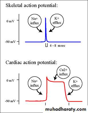 At least two major differences between the membrane properties of cardiac and skeletal muscle account for the prolonged action potential and the plateau in cardiac muscle.