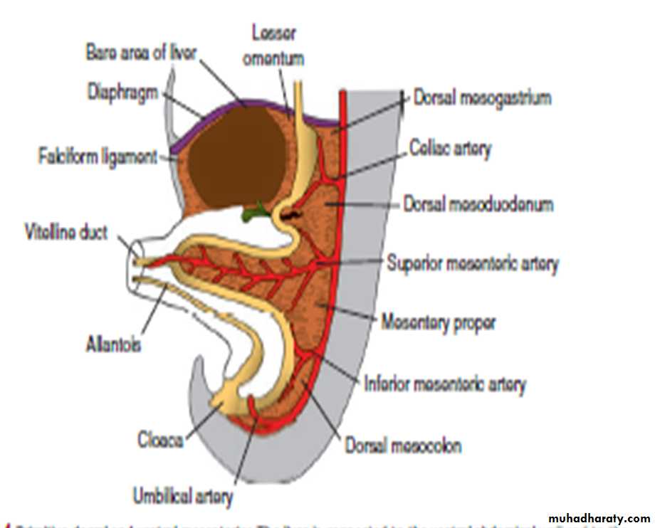 Portions of the gut tube and its derivatives are suspended enclose an organ and connect it to the body wall from the dorsal and ventral body wall by mesenteries, double layers of peritoneum that enclose an organ and connect it to the body wall. Such organs are called intra peritoneal, whereas organs that lie against the posterior body wall and are covered by peritoneum on their anterior surface only (e.g., the kidneys) are considered retroperitoneal.Mesenteries provide pathways for vessels, nerves, and lymphatics to and from abdominal viscera .