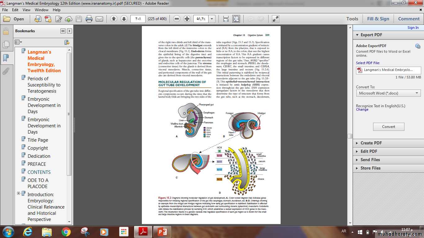The foregut gives rise to the esophagus, trachea and lung buds, the stomach, and the duodenum .In addition, the liver, pancreas, and biliary apparatus.