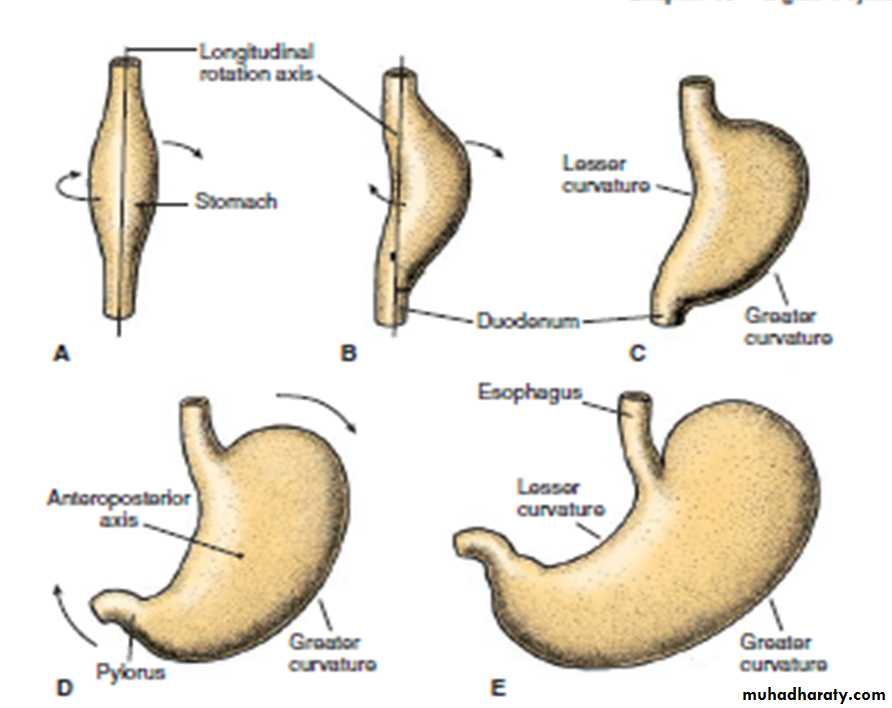 The stomach appears as fusiform dilation of the foregut in the fourth week of development. Positional changes of the stomach are easily explained by assuming that it rotates around a longitudinal and an anteroposterior axis.