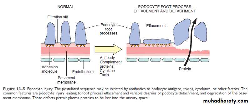 The initial event is the derangement of the capillary walls that leads to increased permeability of plasma protein into the glomerular filtrate. With long standing or extremely heavy proteinuria, serum albumin is decreased resulting in hypoalbuminemia.