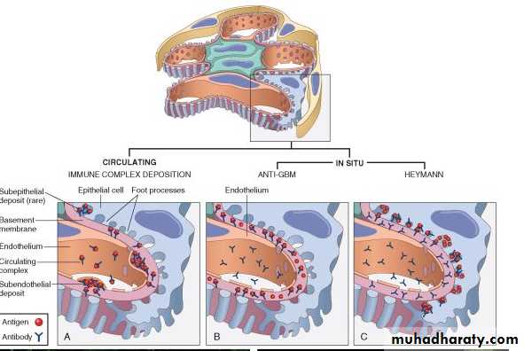 Immune mechanisms (antibody – associated & cellular) underlie most primary and many secondary glomerular diseases:Circulating immune complex- mediated nephritis (type III hypersensitivity reactions)