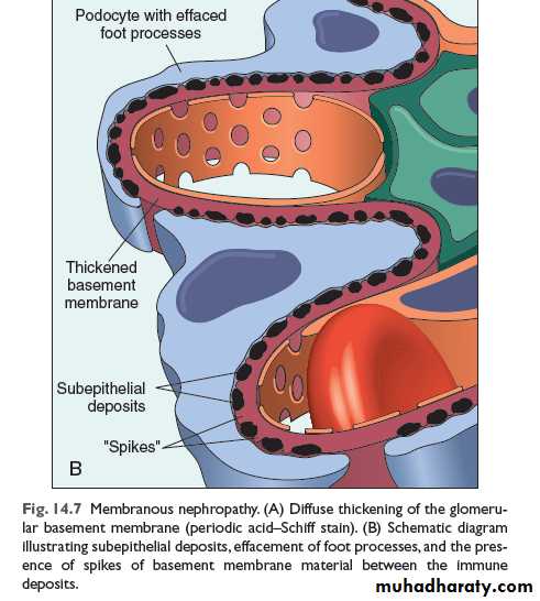 The basic changecs microscopically is the diffuse thickening of the GBM. By E.M. this thickening is caused by subepithelial deposits that are separated from each other by small spike like protrusions of GBM matrix (spike and dome pattern ); these can be highlighted by silver stains. With progression these spikes close over the deposits, to incorporate them into the GMB.