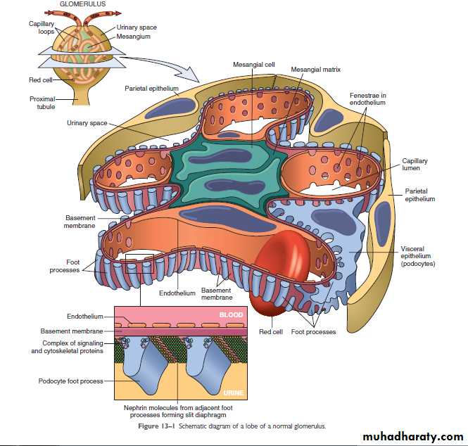 The glomerulus consist of an anastomosing network of capillaries invested by two layers of epithelium; visceral and parietal . the visceral epithelium (podocytes) is an intrinsic part of the capillary wall, whereas the parietal epithelium lines the Bowmans space (urinary space), the cavity in which plasma ultrafiltrate first collects. The glomerular capillary wall is the filtration unite and consists of the following structures:-A thin layer of fenestrated endothelial cells (each hole is about 100 nm in diameter ).
