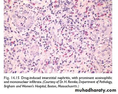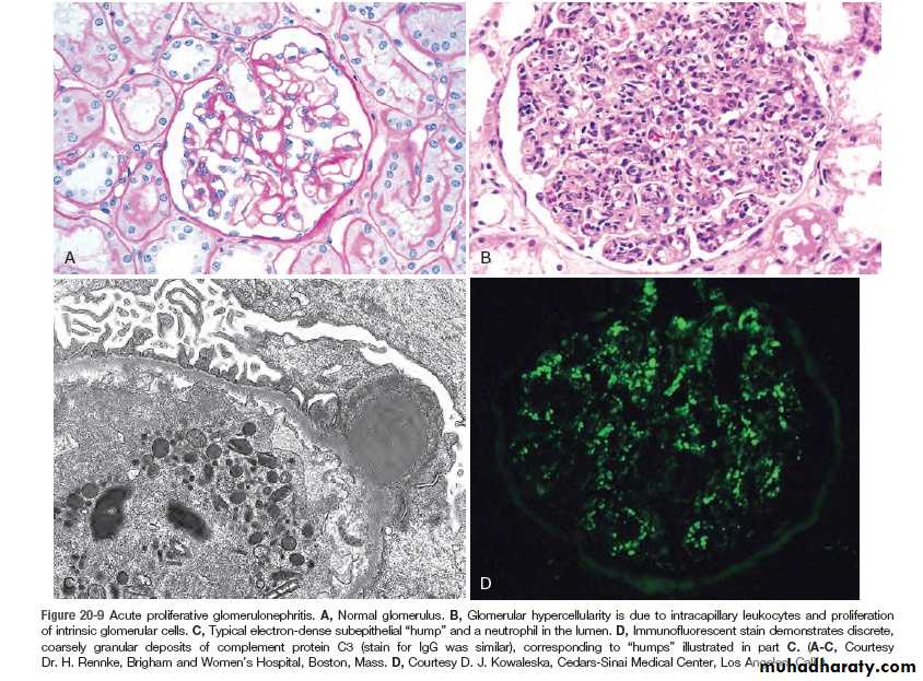 The antigen- antibody complexes are trapped in the glomeruli, where they produce injury mainly through the activation of complement and the recruitment of the leukocytes. E.M reveals the immune complexes as electron dense granular deposits in the glomerulus.