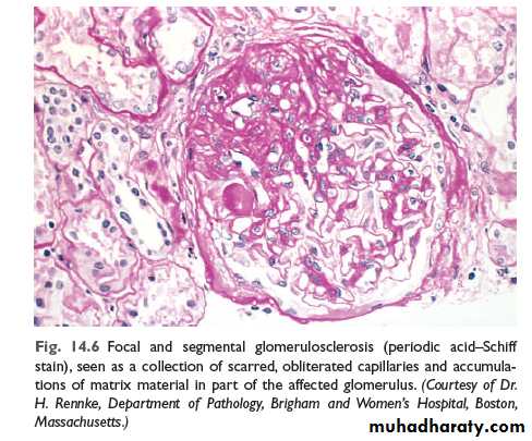 Is characterized histologically by sclerosis (fibrosis) affecting some but not all the glomeruli (focal) and involving only segments of each glomerulus (segmental).FSGS is either primary or secondary. The former is the common cause of nephrotic syndrome in adults (30%) and frequent cause in children (10%). The secondary form is seen with :HIV immunodeficiency or heroin abuse (HIV nephropathy , heroin nephropathy)