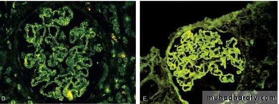 T cell- mediated injury may account for some cases of GN in which either there are no deposits of Ab or immune complexes or the deposits do not correlate with the severity of damageFIGURE 20-4 Antibody-mediated glomerular injury can result either from the deposition of circulating immune complexes (A) or, more commonly, from in situ formation of complexes exemplified by anti-GBM disease (B) or Heymann nephritis (C). D and E, Two patterns of deposition of immune complexes as seen by immunofluorescence microscopy: granular, characteristic of circulating and in situ immune complex nephritis (D), and linear, characteristic of classic anti-GBM disease (E).