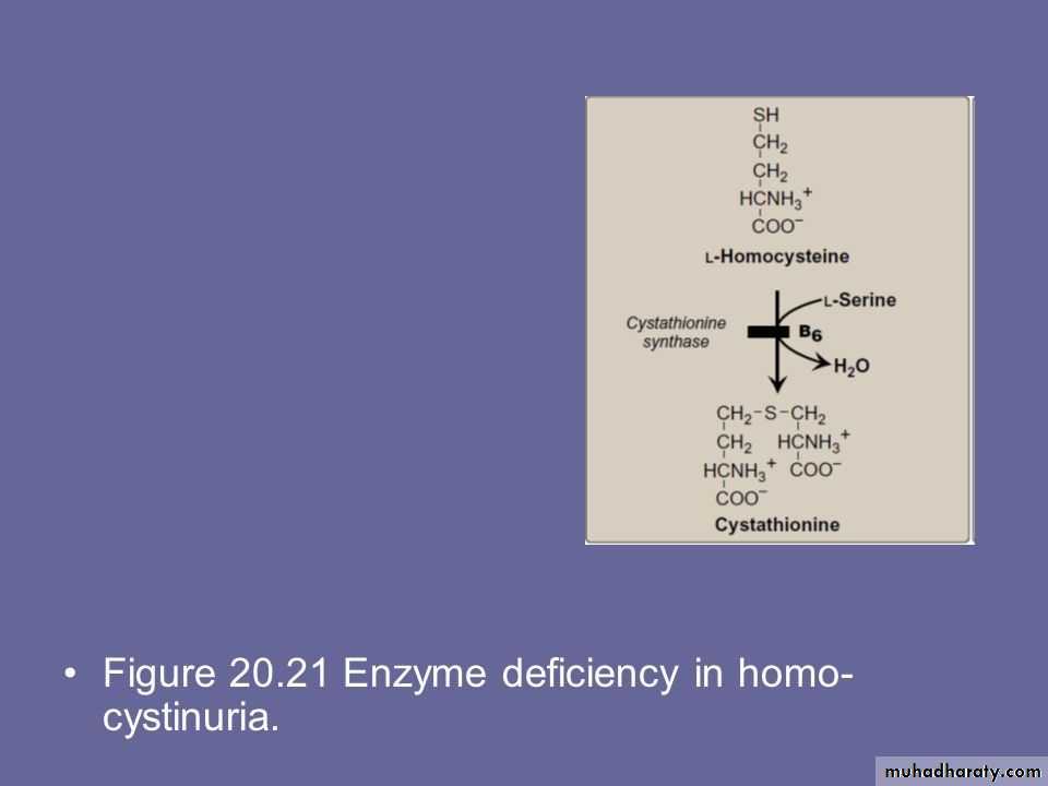 The most common cause of homocystinuria is a defect in the enzyme cystathionine β-synthase, which converts homocysteine to cystathionine. Individuals who are homozygous for cystathionine β-synthase deficiency exhibit ectopia lentis (displacement of the lens of the eye), skeletal abnormalities, premature arterial disease, osteoporosis, and mental retardation.