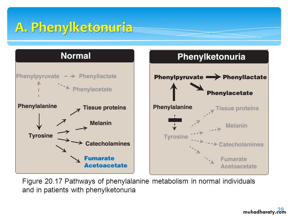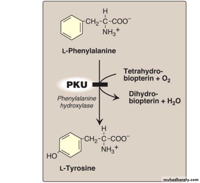 Phenylketonuria (PKU), caused by a deficiency of phenylalanine hydroxylase , PKU is the most common clinically encountered inborn error of amino acid metabolism (prevalence 1:15,000). Biochemically, it is characterized by accumulation of phenylalanine (and a deficiency of tyrosine).Characteristics of classic PKU: