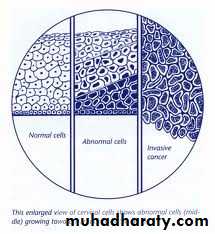Wide spread of papanicolaou (cytological) screening or pap smear has dramatically lowered the incidence of invasive tumor, because most or all of invasive cervical squamous cell carcinomas arise from precursor epithelial changes (CIN) but not all cases of CIN progress to invasive cancer, it may be regress, that's the precancerous epithelial changes (CIN) may precede the development of cancer by many years, so cellular atypia of squamous lining epithelium it's divided into 3 grades: