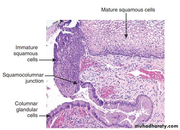 We must differetaite true inflammatory cervicitis from so called "erosions", during development the columnar mucus secreting epithelium of the endocervix meets the squamous epithelial of ectocervix at the external os, in young women there's down-growth of the columnar epithelium below the ectocervical os-ectropian so squamocolumnar junction lie below exocervix, this exposed mucus-secreting columnar epithelium may appear reddened and moist and is mistakenly called cervical "erosion" but in elderly there's regrowth of the squamous epithelium up to the original external os. The area replaced by the squamous epithelium is known as the "transformation zone"