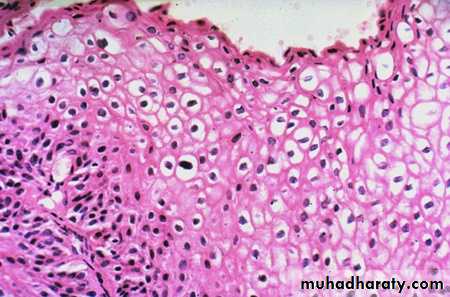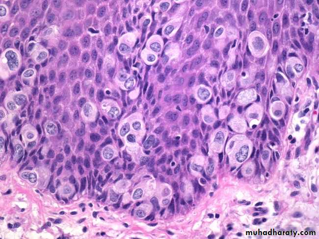 Microscopically: appear in epidermal layer, the characteristic cellular feature is koilocytosis (a cytopathic change characterized by perinuclear cytoplasmic vacuolization and a wrinkled nuclear contour), a hallmark of HPV infection .