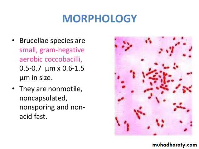 Brucellae are Gram-negative coccobacilli (short rods) measuring about 0.6 to 1.5 μm by 0.5-0.7 μm.They are non-sporing and lack capsules or flagella and, therefore, are non-motile.