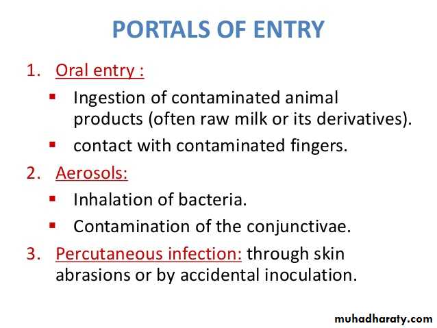 Skin , contaminated milk and cheese, Aerosols to the mucosa of nose, mouth & conjunctiva))↓