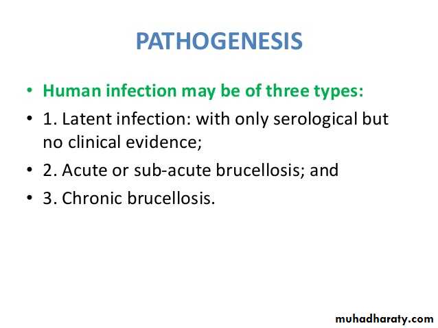 Brucella organisms, which are small aerobic intracellular coccobacilli, localize in the reproductive organs of host animals, causing abortions and sterility. They are shed in large numbers in the animal’s urine, milk, placental fluid, and other fluids. Humans are accidental hosts, but brucellosis continues to be a major public health concern worldwide and is the most common zoonotic infection. That characterized by an acute bacteremia phase followed by a chronic stage that may extend over many years and may involve many tissues.The common routes of infection in humans are the intestinal tract (ingestion of infected milk), mucous membranes (droplets), and skin (contact with infected tissues of animals). The organisms progress from the portal of entry via lymphatic channels and regional lymph nodes to the thoracic duct and the bloodstream which distributes them to the parenchyma organs. Granulomatous nodules that may develop into abscesses form in lymphatic tissue, liver, spleen, bone marrow, and other parts of the reticuloendothelial system.