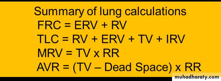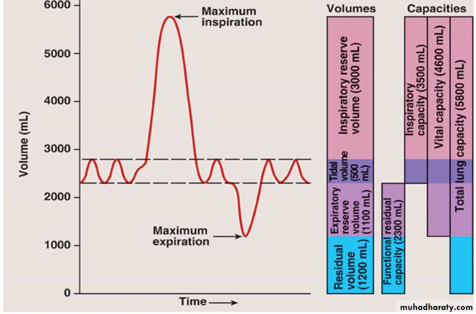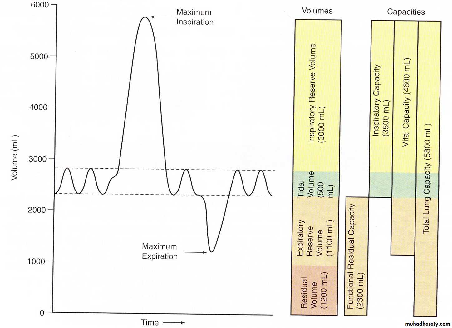 Pulmonary volumes are:1-Tidal volume (VT): About 500 ml.2-Inspiratory reserve volume (IRV): About 3000 ml.3-Expiratory reserve volume (ERV): About 1100 ml.4-Residual volume (RV): ab. 1200 ml.Pulmonary capacities are:1-Inspiratory capacity (IC)= VT + IRV ≈ 3500 ml.2-Functional residual capacity (FRC) FRC = ERV + RV ≈ 2300 ml.3-Vital capacity (VC) = VT+ IRV+ERV ≈ 4600 ml.4-Total lung capacity (TLC) = VC + RV ≈ 5800ml.
