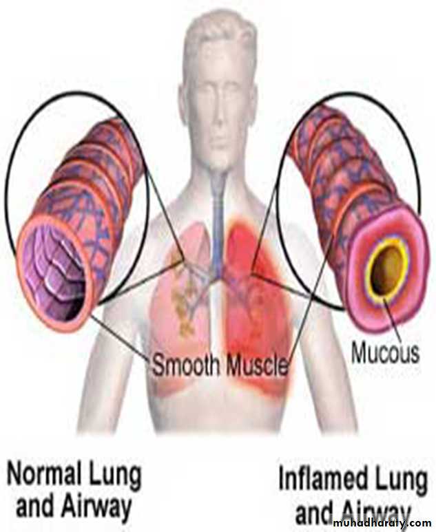 ⚫ Obstructive air flow through bronchioles, Caused by inflammation and mucus secretion.⚫ Inflammation contributes to increased airway responsiveness to agents that promote bronchial constriction.