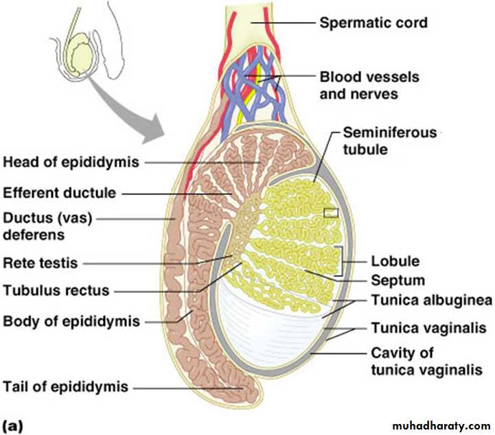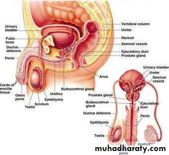The internal male genitalia consist of the testes with the adjoining epididymis, the vas deferens and the accessory sex glands, namely the seminal vesicles, the prostrate and the bulbourethral glands (the latter sometimes are included in the external genitalia).Testes