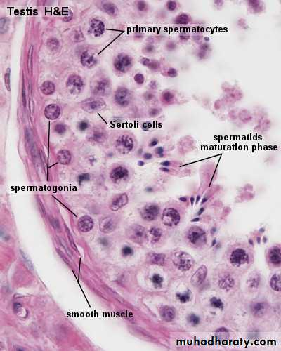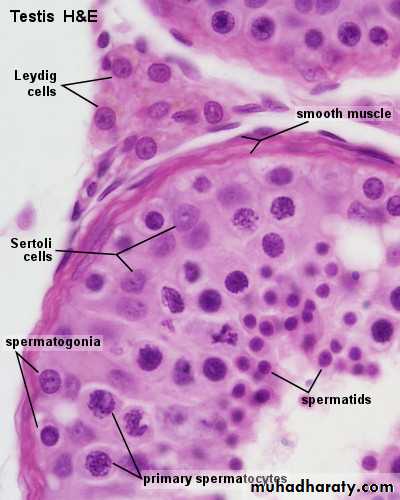 These tubules are enclosed by a thick basal lamina and surrounded by 3-4 layers of smooth muscle cells (or myoid cells). The insides of the tubules are lined with seminiferous epithelium, which consists of two general types of cells: spermatogenic cells and Sertoli cells.Spermatogenic cells: