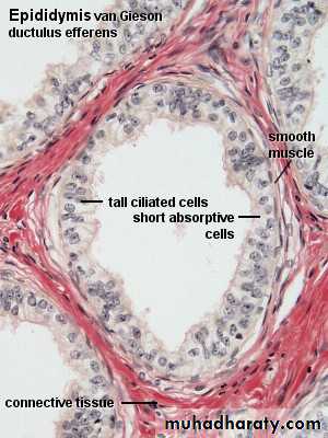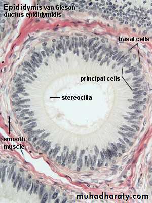 Spermatozoa pass via the tubuli recti (low columnar epithelium) and the rete testis (flattened or cuboidal epithelium) into numerous ductuli efferentes, which are lined by a columnar epithelium, which consists of both absorptive and ciliated cells. The height of the two cells types which form the epithelium of the ductuli efferentes is variable which gives the lumen a characteristic wavy outline.The ductuli efferentes leave the testis and open into a common duct, the ductus epididymidis (about 6 m long!). It is lined by a very tall pseudostratified columnar epithelium. Most cells of the epithelium, also called principal cells, have long stereocilia. Stereocilia are non-motile structures, which in the EM resemble large microvilli. Towards the basal lamina we see a number of small nuclei, which belong to the basal cells of the ductus epididymidis. These cells regenerate the epithelium.