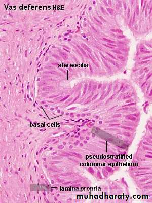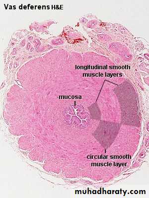 The mucosa of the vas deferens forms low longitudinal folds. It is lined by a pseudostratified columnar epithelium. Similar to the epididymis, cells have long stereocilia. The lamina propria is unusually rich in elastic fibres. The muscularis is well developed (up to 1.5 mm thick) and consists of a thick circular layer of smooth muscle between thinner inner and outer longitudinal layers. The muscularis is the structure which makes the vas deferens palpable in the spermatic cord. The vas deferens is surrounded by an adventitia, which is slightly denser than usual.Male Accessory Reproductive Glands