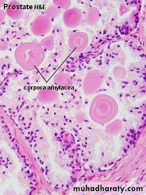 A characteristic feature of the prostate is the appearance of corpora amylacea in the secretory alveoli. They are rounded eosinophilic bodies. Their average diameter is about 0.25 mm (up to 2 mm).. They may undergo calcification. Corpora amylacea may appear in semen.
