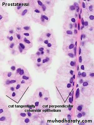 With age the prostate becomes enlarged due to benign nodular hyperplasia. The onset age of these hyperplastic changes is 45. About 3/4 of the males above 60 are affected of which half will be symptomatic. This condition affects the mucosal glands.Cancer of the prostate, which is the second most common malignant tumor in western males, involves the peripheral zone.