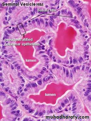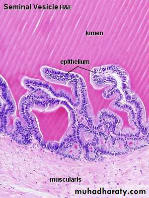 The seminal vesicles develop from the vas deferens. Their histological organisation resembles to some extent that of the vas deferens. They are elongated sacs (about 4 cm long and 2 cm wide), which taper where they unite with the vas deferens. Each seminal vesicle consists of one coiling tube (about 15cm long). All the lumina visible in sections of the seminal vesicle are in continuity in the intact organ.The mucosa shows thin, branched, anastomosing folds. The structure of the epithelium is variable appearing columnar or pseudostratified columnar (columnar cells and basal cells). The lamina propria of the mucosa is fairly thin and loose. The muscularis consists of inner circular and outer longitudinal layers of smooth muscle.