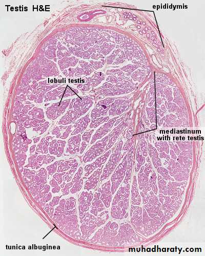 The testis is surrounded by a thick capsule, the tunica albuginea, from which a conical mass of connective tissue, the mediastinum testis, projects into the testis. The tunica albuginea is covered externally by a serosa..