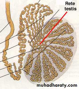Each seminiferous tubule continues near the mediastinum into a straight tubule, a tubulus rectus. The straight tubules continue into the rete testis, a labyrinthine system of cavities in the mediastinum.