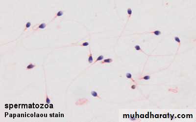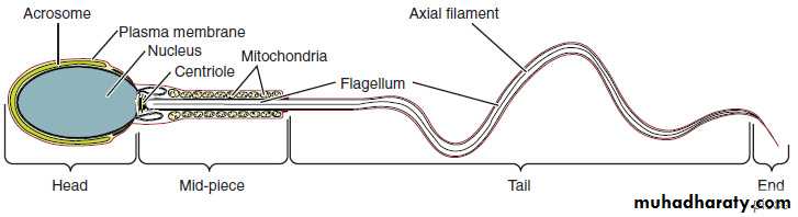 The mature human spermatozoon is about 60 µm long and actively motile. It is divided into head, neck and tail.The head (flattened, about 5 µm long and 3 µm wide) chiefly consists of the nucleus (greatly condensed chromatin!). The anterior 2/3 of the nucleus is covered by the acrosome, which contains enzymes important in the process of fertilisation. The posterior parts of the nuclear membrane forms the so-called basal plate.