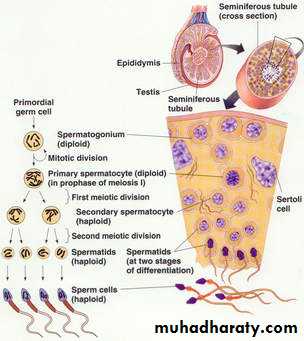 takes about 48 days from the time cells enter meiosis until morphologically mature spermatozoa are formed. Depending on the length of reproduction of spermatogonia (which is not precisely determined) it takes approximately 64 days to complete spermatogenesis.Spermatogenesis is regulated by follicle stimulating hormone (FSH), which in males stimulates the spermatogenic epithelium, and luteinizing-hormone (LH), which in males stimulates testosterone production by Leydig cells in the interstitia