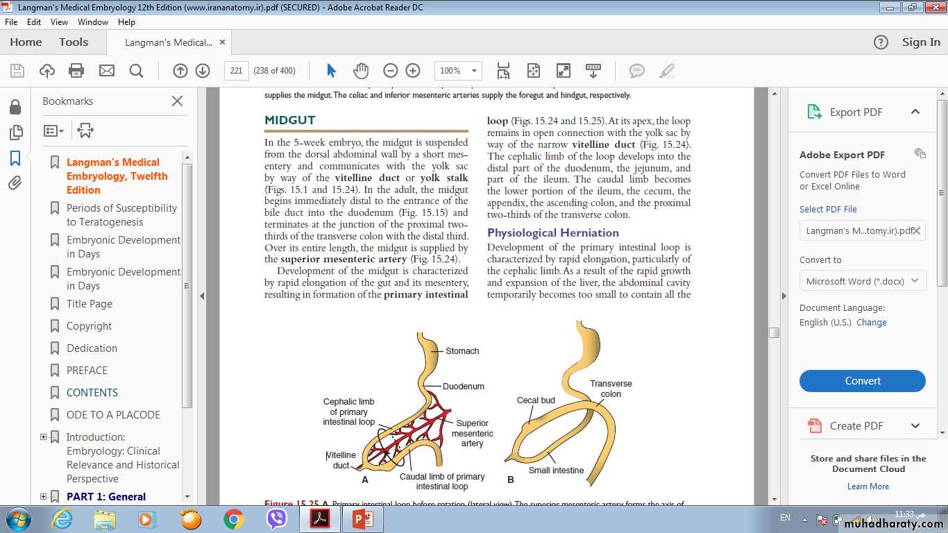 In the 5-week embryo, the midgut is suspended from the dorsal abdominal wall by a short mesentery and communicates with the yolk sac by way of the vitelline duct or yolk stalk . In the adult, the midgut begins immediately distal to the entrance of the bile duct into the duodenum and terminates at the junction of the proximal two thirds of the transverse colon with the distal third.Development of the midgut is characterized by rapid elongation of the