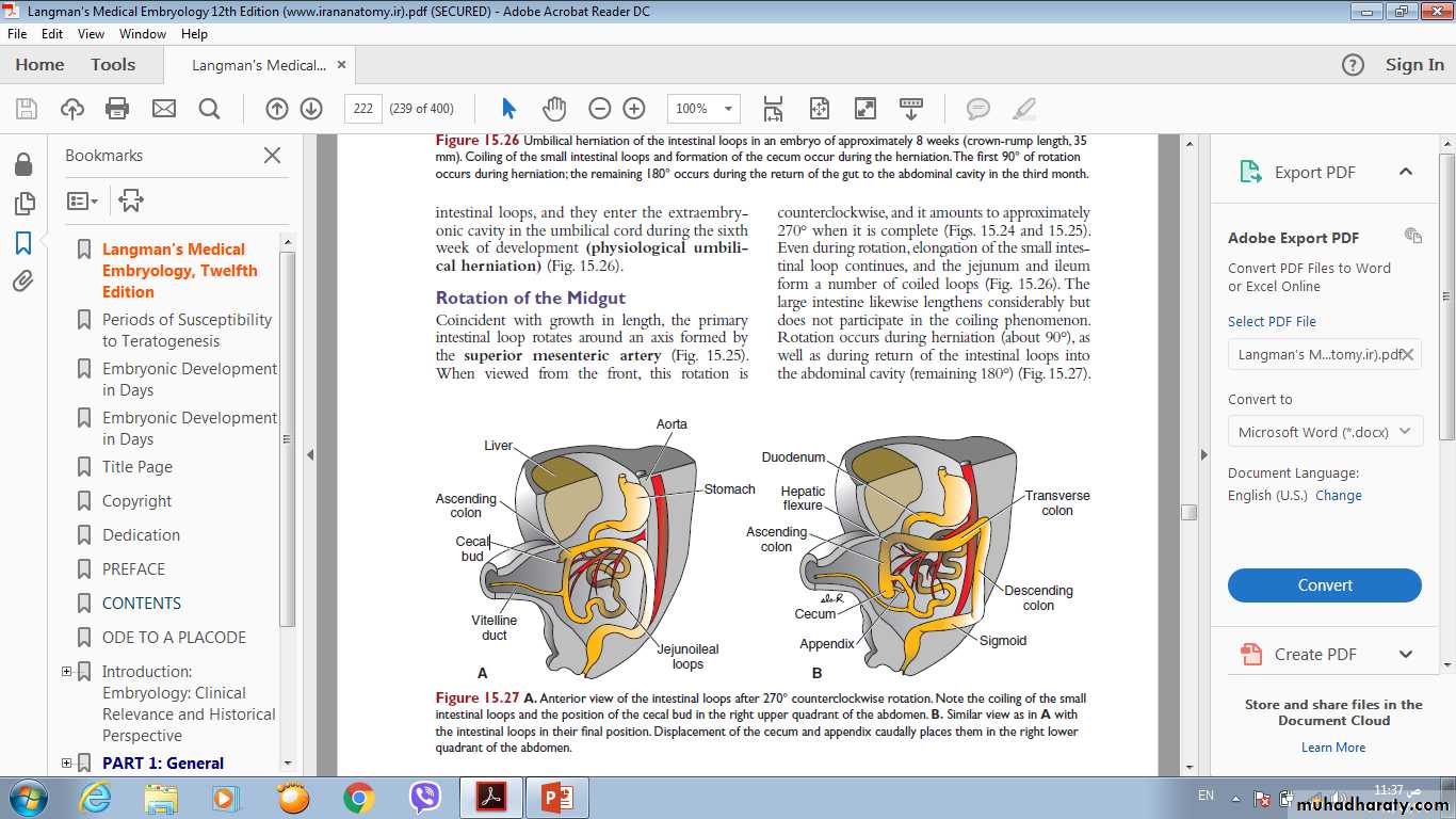 mid gut loop rotates 270° counterclockwise. Remnants of the vitelline duct, failure of the mid gut to return to the abdominal cavity, malrotation, stenosis ,and duplication of parts of the gut are common mid gut abnormalities.