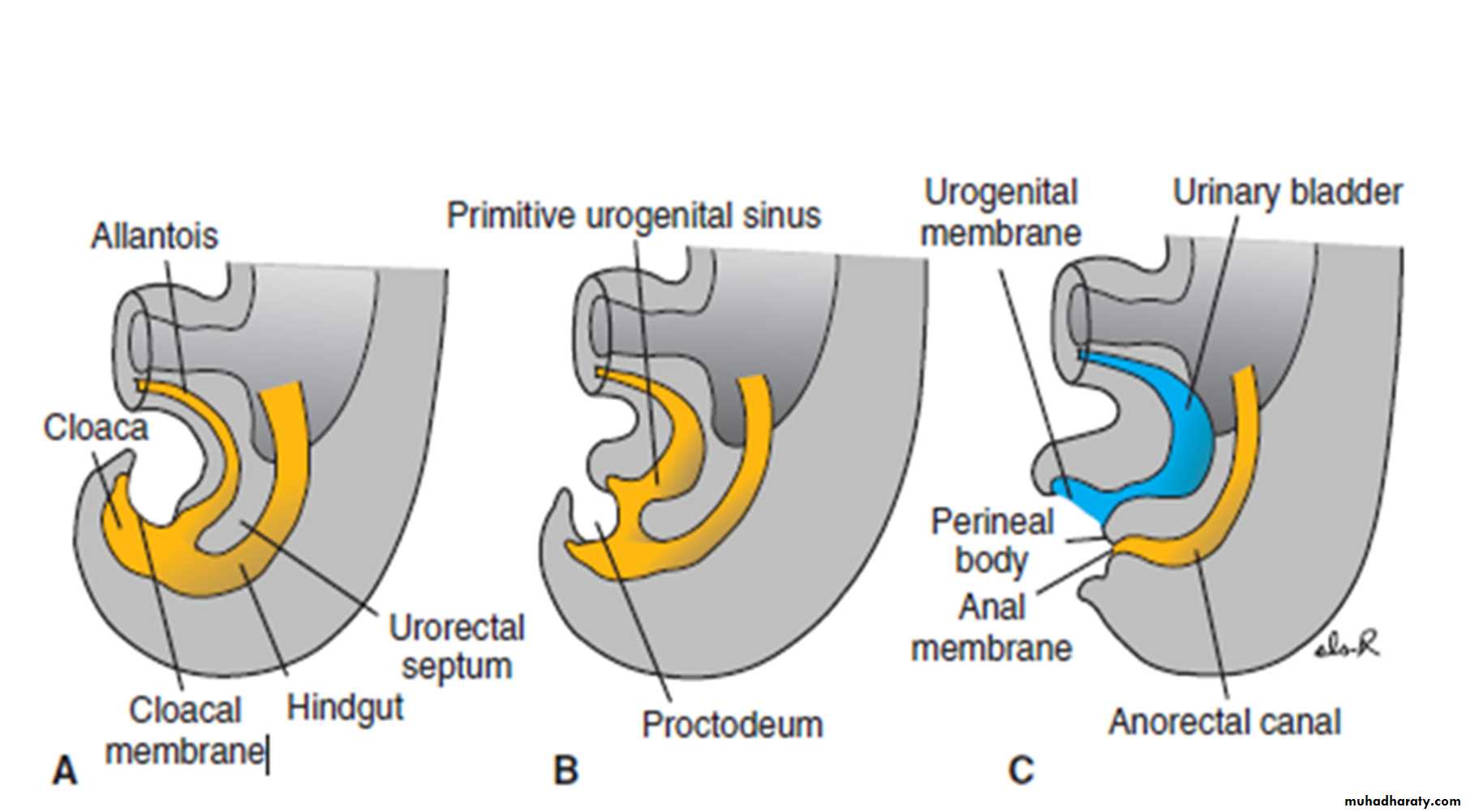 • At the end of the seventh week, the cloacal membrane ruptures, creating the anal opening for the hindgut, and a ventral opening for the urogenital sinus. Between the two, the tip of the urorectal septum forms the perineal body.