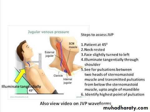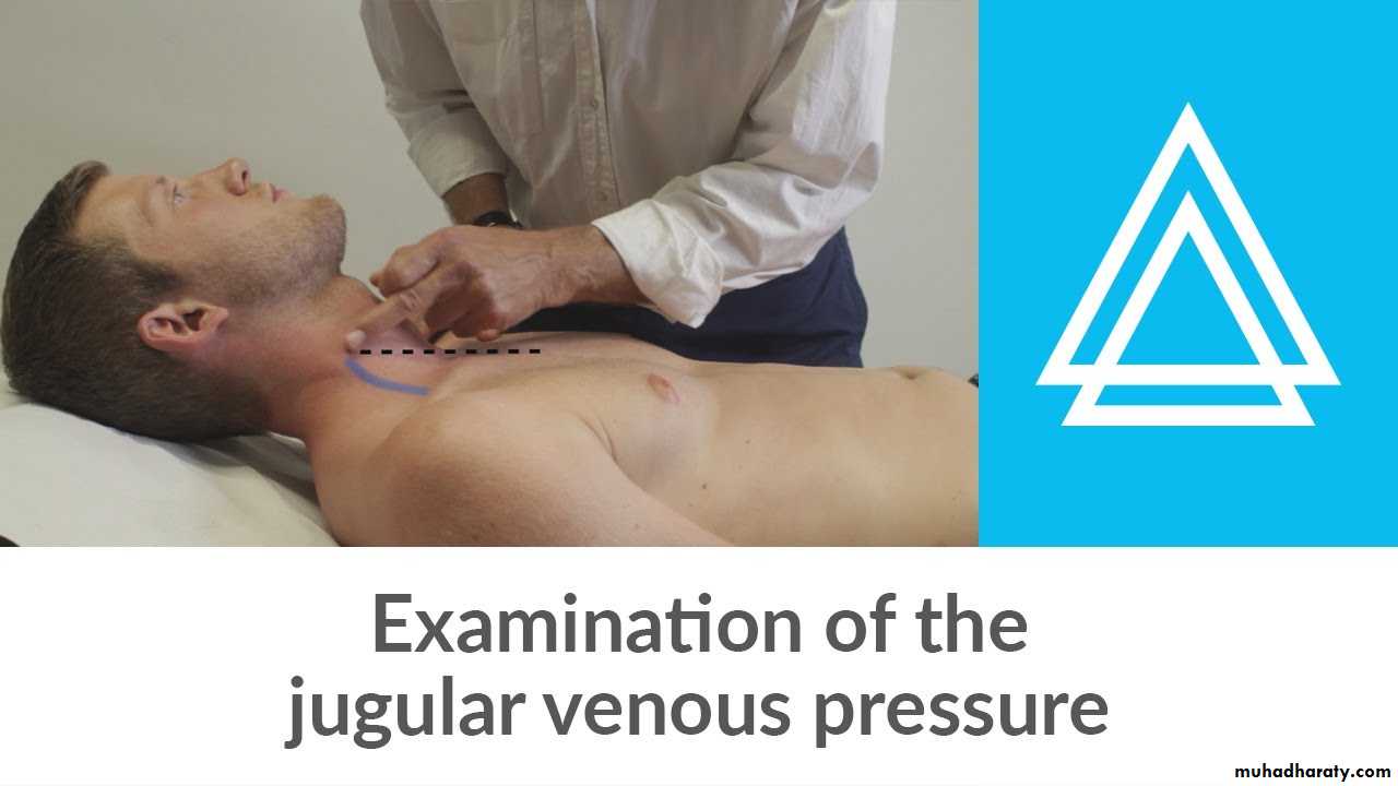The jugular venous pressure (JVP, sometimes referred to as jugular venous pulse) is the indirectly observed pressure over the venous system via visualization of the internal jugular vein. It can be useful in the differentiation of different forms of heart and lung disease. Classically three upward deflections and two downward deflections have been described.• The upward deflections are the "a" (atrial contraction), "c" (ventricular contraction and resulting bulging of tricuspid into the right atrium during isovolumetric systole) and "v" = venous filling