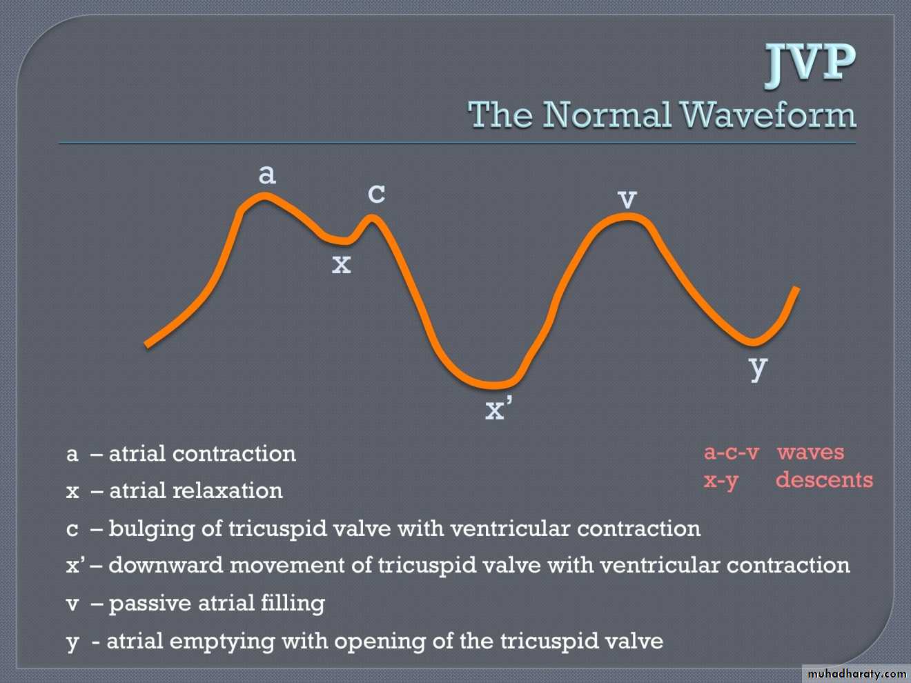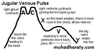 • The downward deflections of the wave are the "x" (the atrium relaxes and the tricuspid valve moves downward) and the "y" descent (filling of ventricle after tricuspid opening).