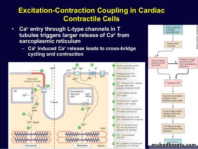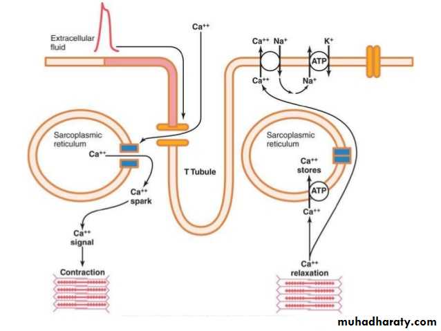 This mechanism of excitation-contraction coupling is the same as that for skeletal muscle, but there is a second effect that is quite different. In addition to the calcium ions that are released into the sarcoplasm from the cisternae of the sarcoplasmic reticulum, calcium ions also diffuse into the sarcoplasm from the T tubules themselves at the time of the action potential, which opens voltage-dependent calcium channels in the membrane of the T tubule .