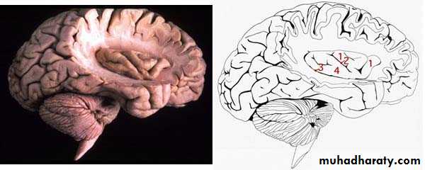 • laterally in the lateral cerebral sulcus.