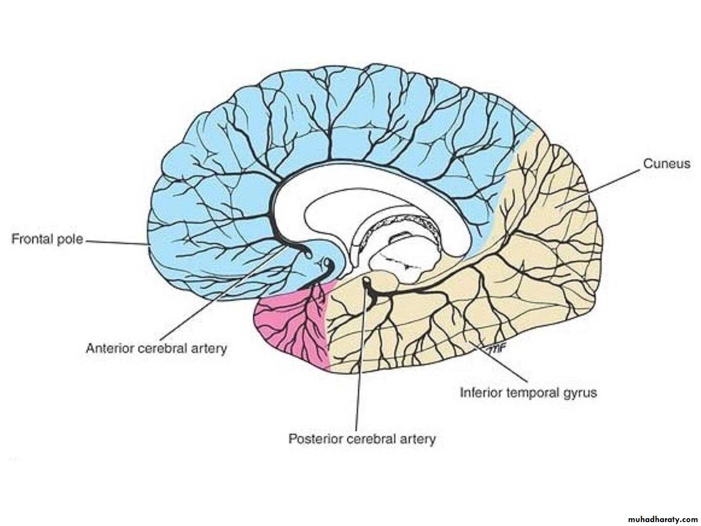 • The cortical branches supply all the medial• surface of the cerebral cortex as far back as