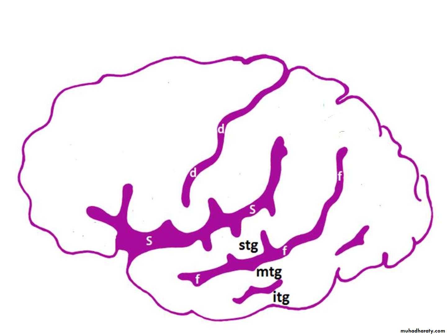 Superior & inferior temporal sulci giving rise to superior, middle & inferior temporal gyri.Insula: the gyrus in the depth of lateral fissure, covered by parts of frontal, parietal & temporal lobes called the opercula (removed in lower picture.).