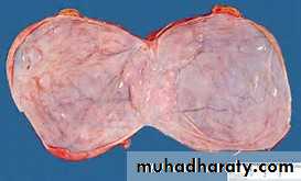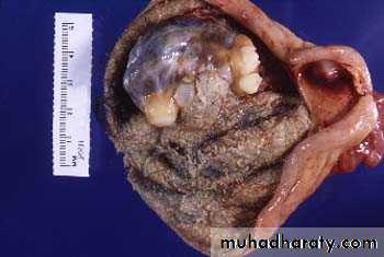 Grossly: serous tumor may be small 5 to 10 cm or may reached even 40 cm in diameter, the surface in benign one is smooth and glistening while in malignant one is irregular, cut section reveal unilocular or more multilocular cysts filled by serous fluid and smooth inner surface in benign one while in malignant tumor the inner surface usually contain polypoid and papillary growth.