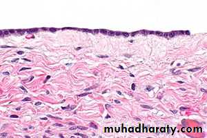 Microscopically: in benign one usually consist of thin wall lined by single layer of tall columnar serous epithelial cells.