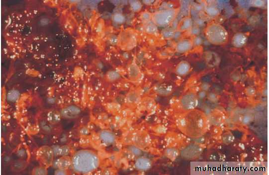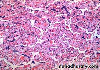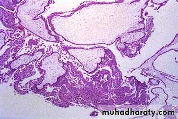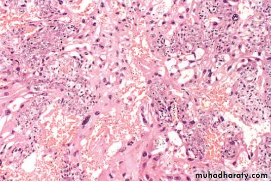 Microscopically: it's seen as very hemorrhagic necrotic masses within the uterus, sometimes the necrosis is complete to destruct the primary neoplasm and remain only the metastasis, in contrast to H.mole chorionic villi are not formed and consist from only malignant cyto and syncitiotrophoblast and this tumor is wide spread by blood but lymphatic invasion is not common.