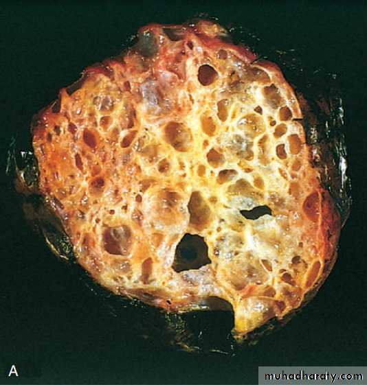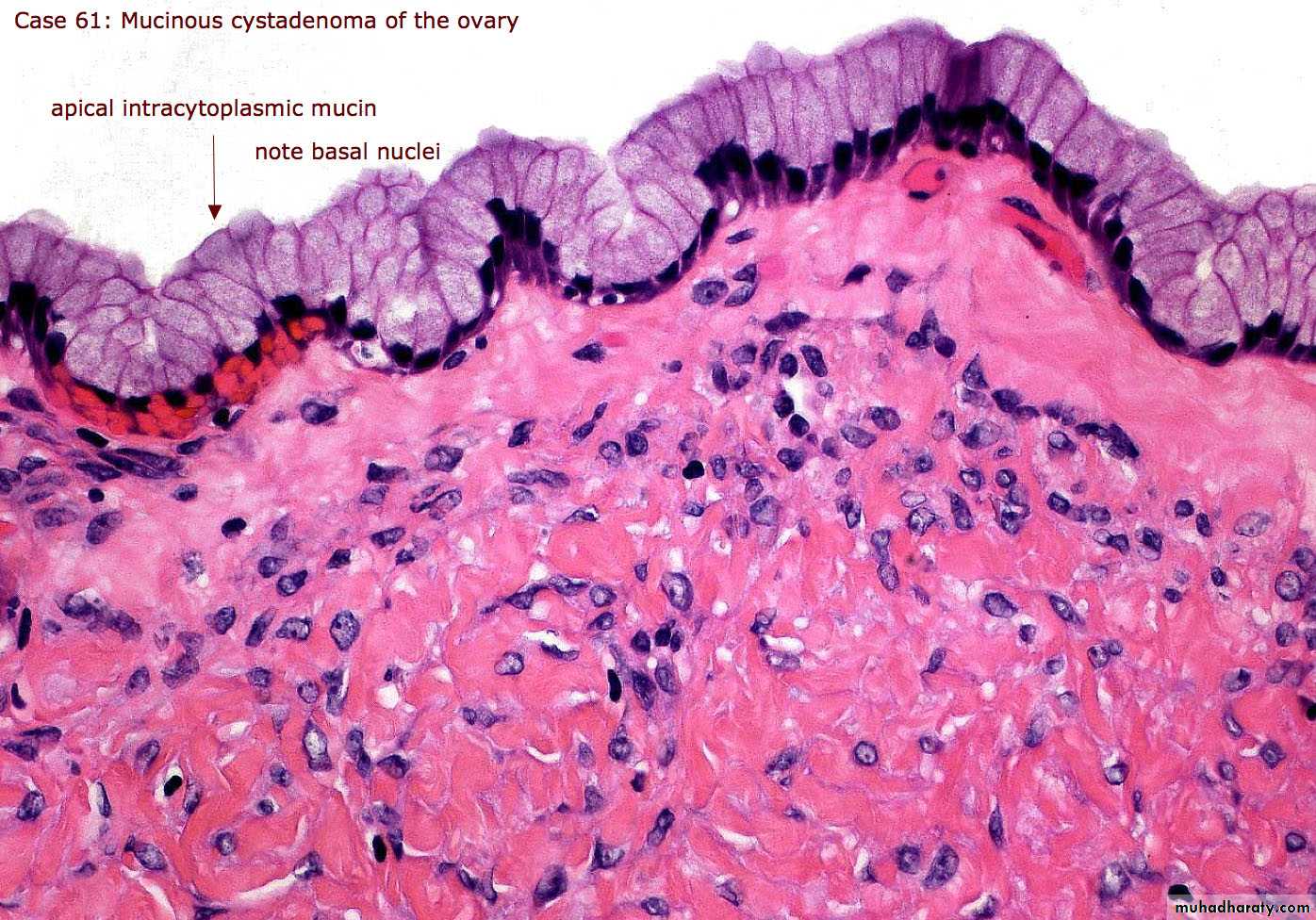 This usually analogous to serous tumor but it's usually larger than serous cyst and multilocular, it's lined by mucous secreting cells as endocervical cells.Grossly: it can't be differentiated from serous cysts but on cut section reveal mucinous thick material.