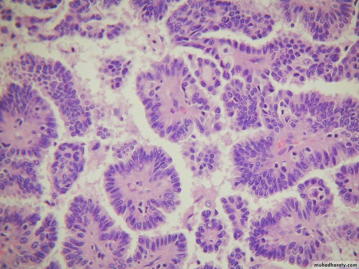 Microscopically: in benign tumor, it consist of thin wall lined by single layer of mucous secreting cells which consist of apical vacuoles and basal located nuclei, in malignant one also consist of complex papillae lined by multilayering malignant cells with stromal invasion which's not seen in borderline tumor.