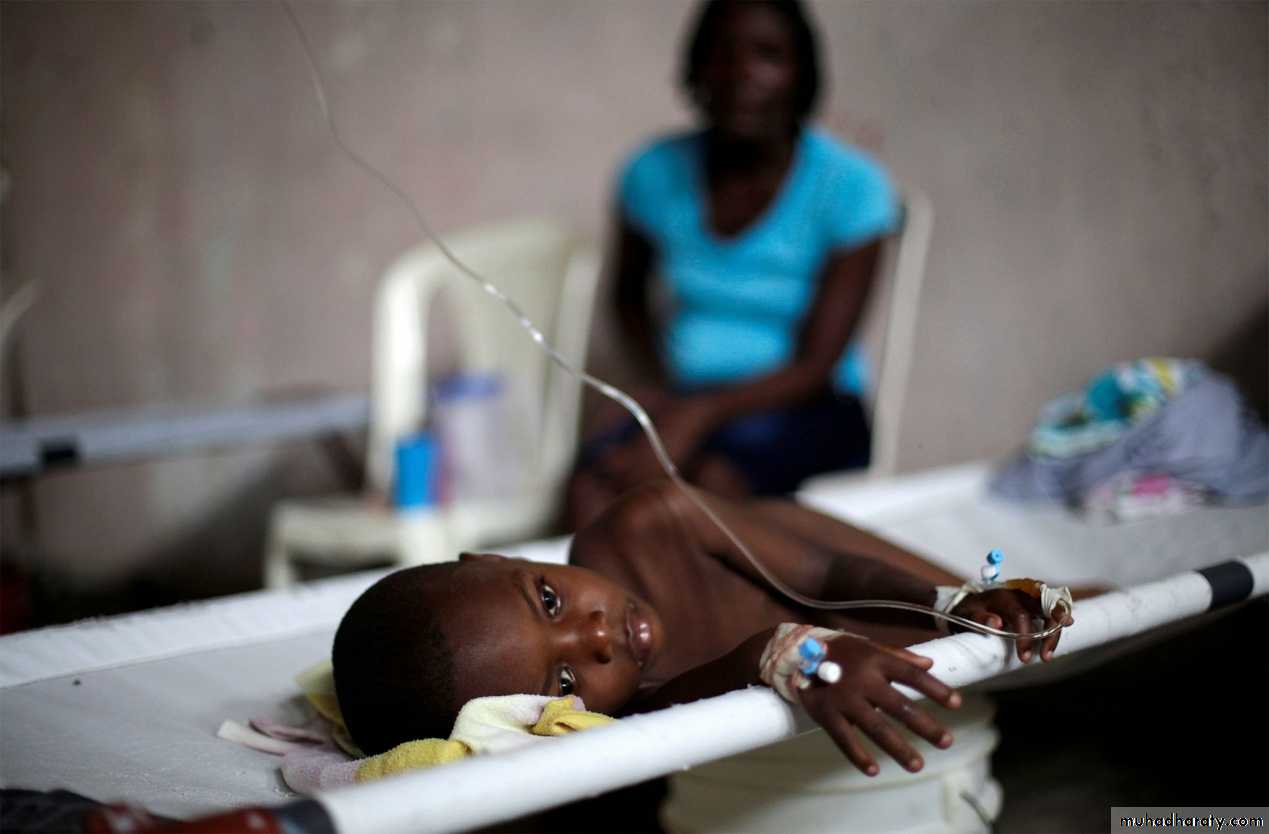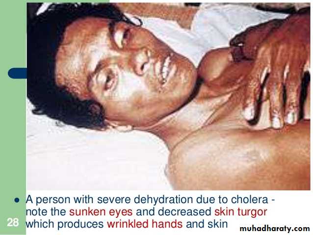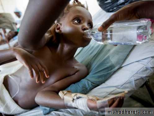 • 1-The most important part of therapy consists of water and electrolyte replacement to correct the severe dehydration and salt depletion.